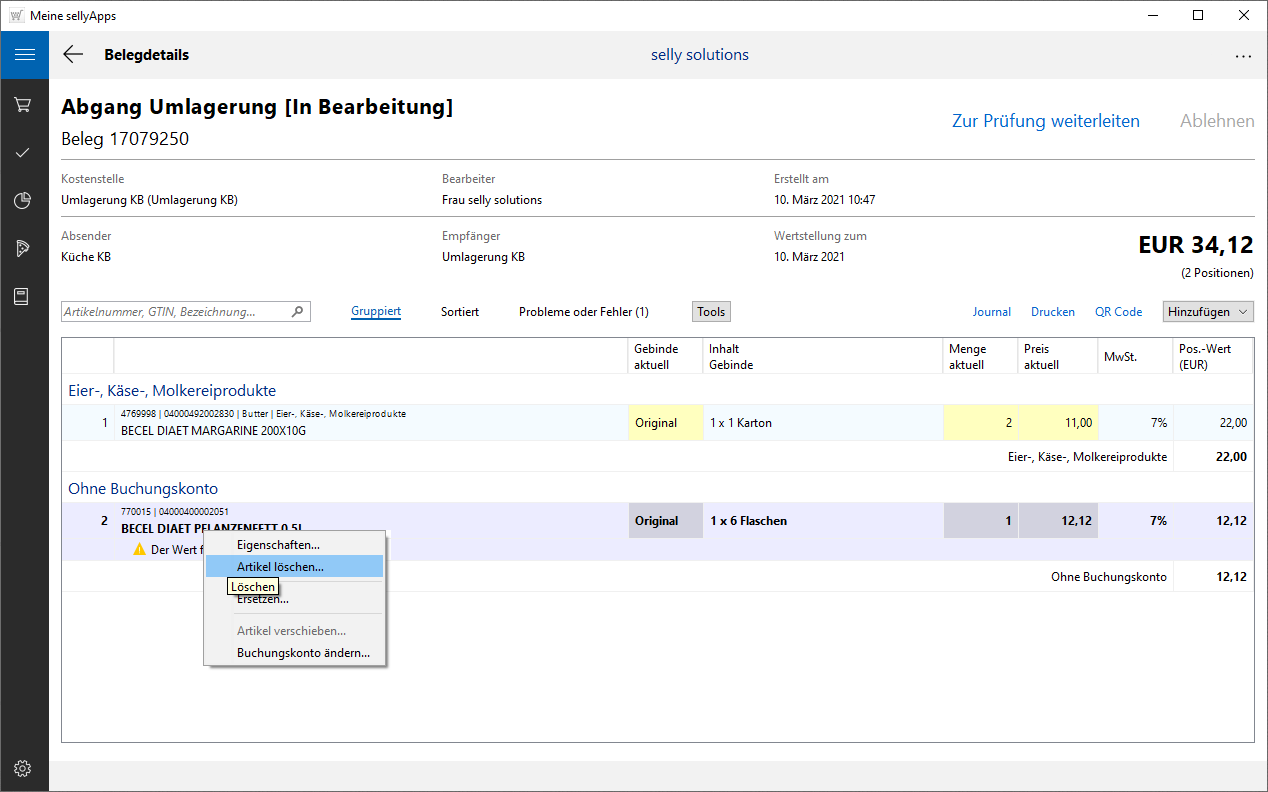 Im Bereich Warenbewegungen, in den sellyApps, können Sie Positionen aus Ihrem Beleg entfernen. Sie rufen dazu die Belegdetails auf.