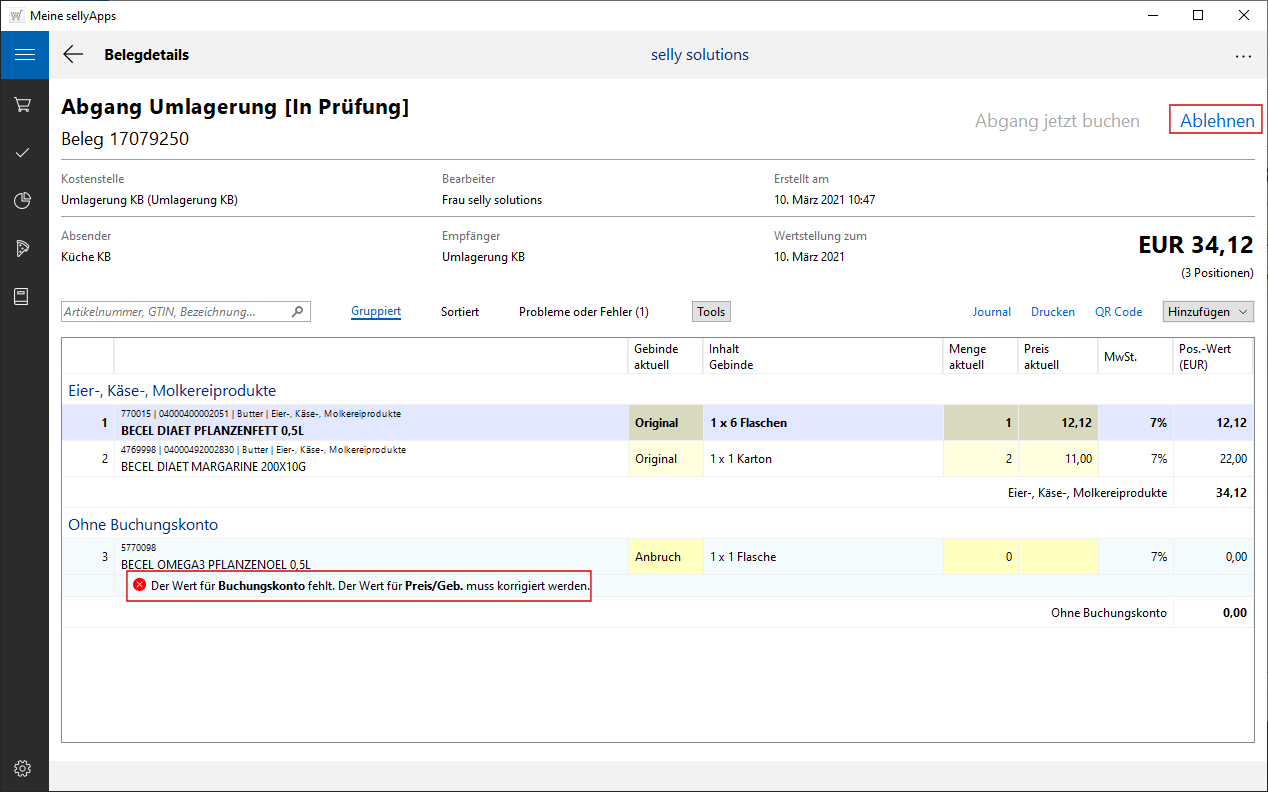Das bedeutet, dass dieser Umlagerungsbeleg nicht gebucht werden kann und somit eine Ablehnung erfolgt, wonach der Beleg erneut im Status In Bearbeitung ist.