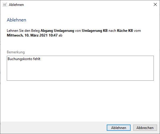 Erfolgt das Ablehnen muss im nachfolgenden Dialog eine Bemerkung angegeben werden.