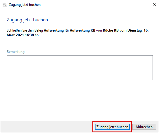 Mit einem letzten Klick auf [Zugang jetzt buchen] schließen Sie den Buchungsvorgang Ihres Aufwertungsbeleges ab.