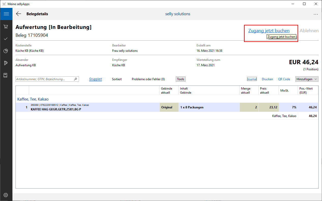 Wäre der Beleg in allen Positionen fehlerfrei, würde der Buchungsvorgang ohne Prüfung- bzw.- Bestätigungsschritt erfolgen (s. u. Zugang jetzt buchen). Es ist dafür ein entsprechendes Recht notwendig.