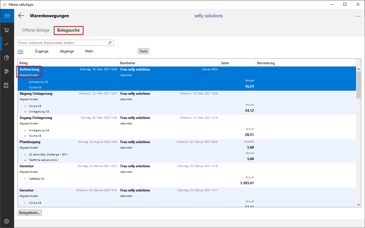 Jeder abgeschlossene Beleg ist im Belegarchiv zu finden, so auch Ihr Beleg für eine Aufwertung. Zum Aufruf bzw. Ansicht nutzen Sie den Funktionslink Belegsuche (s. Markierung). Der Beleg hat jetzt den Status Abgeschlossen (s. Markierung).