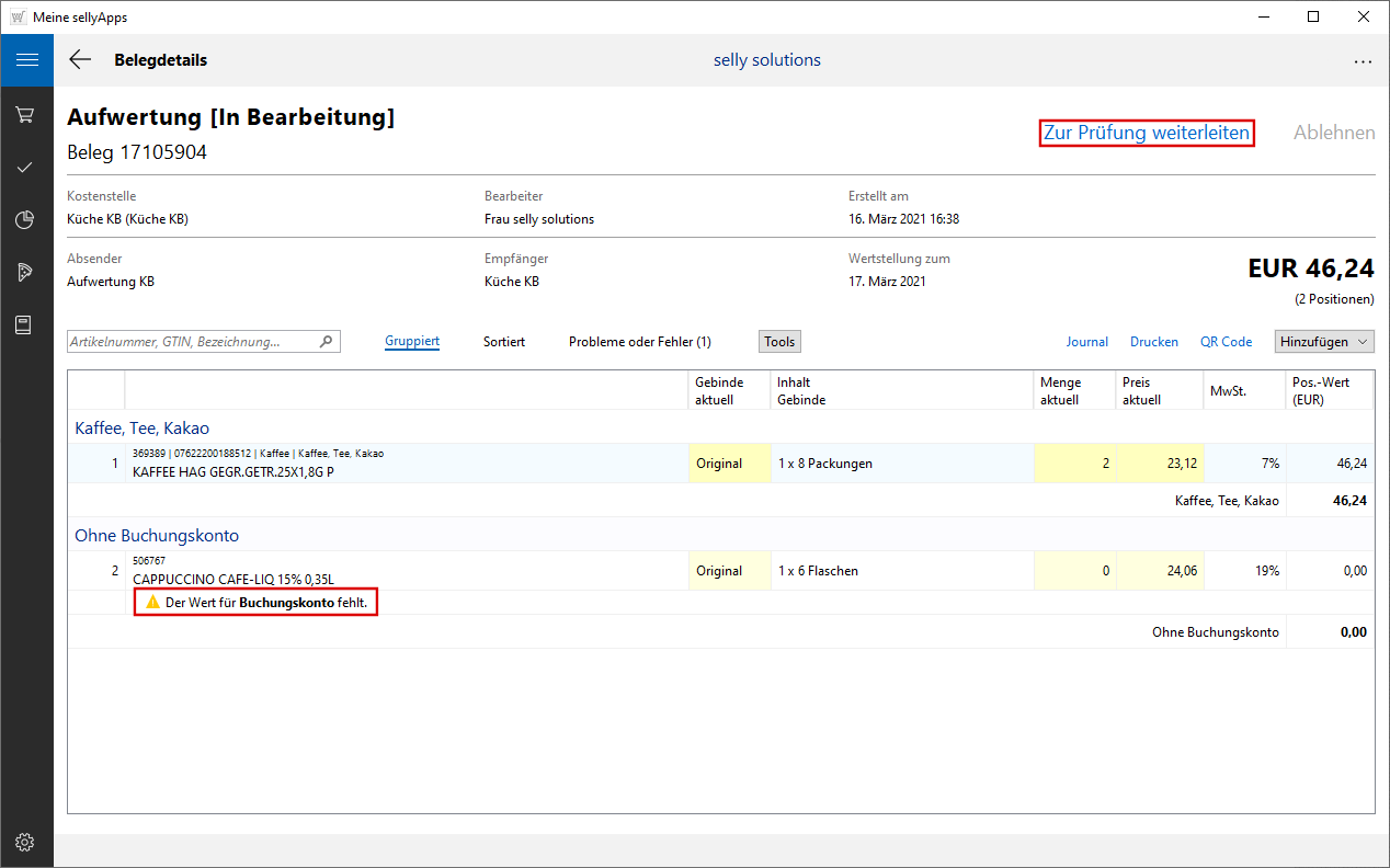 Der Beleg verbleibt auch nach Weiterleitung in der Liste In Bearbeitung und Prüfung, wird jetzt aber mit dem Status In Prüfung gekennzeichnet. Sie müssen für diesen Artikel eine entsprechende Korrektur vornehmen.
