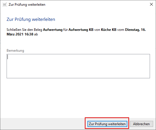 Sie können diesen Beleg zunächst nur zur Prüfung weiterleiten und nutzen dazu gleichnamigen Funktionslink.