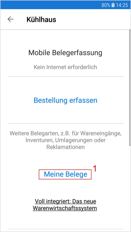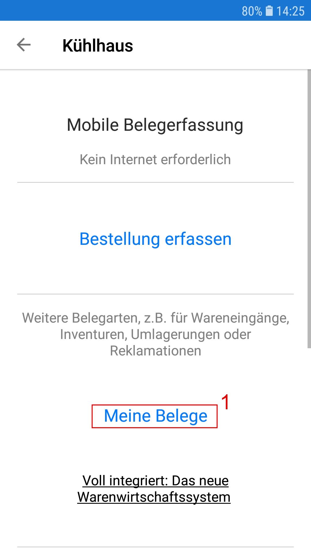 Sie wählen den Beleg, den Sie bearbeiten möchten, durch Antippen, entweder des Menü-Icons oder der Belegzeile, aus (s. rechts Markierung 2).