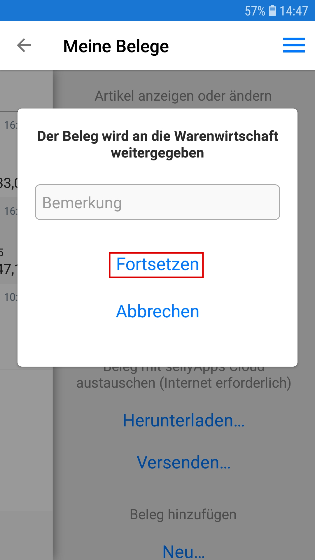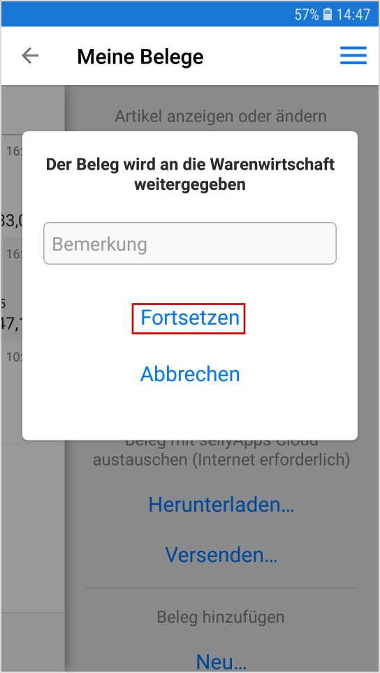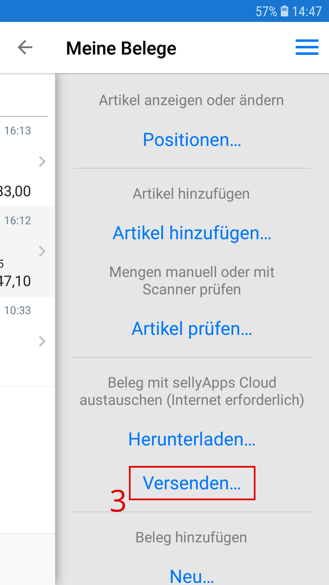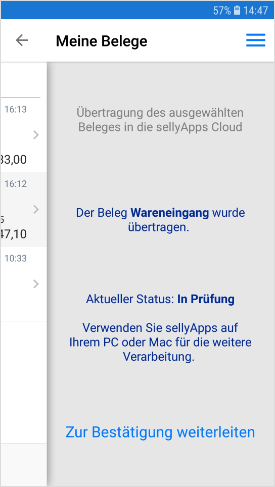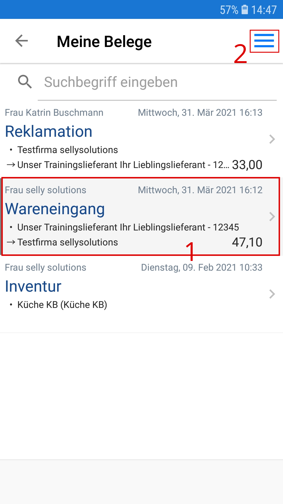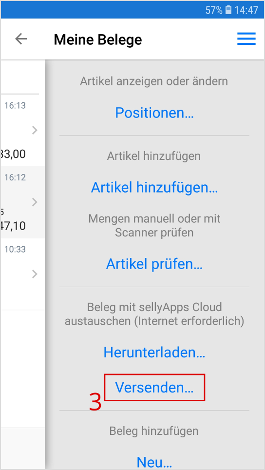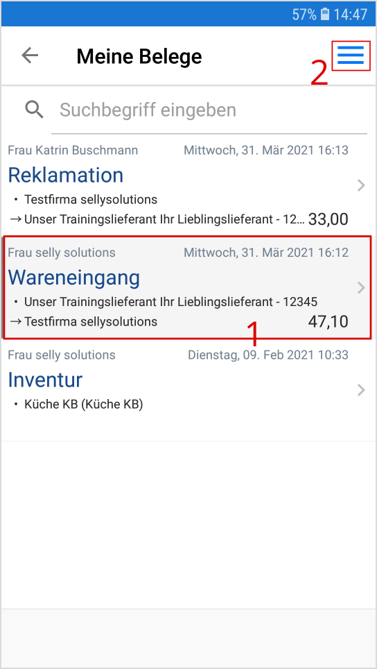 Sie wählen den Beleg, den Sie bearbeiten möchten, durch Antippen, entweder des Menü-Icons oder der Belegzeile, aus (s. Markierung 2).