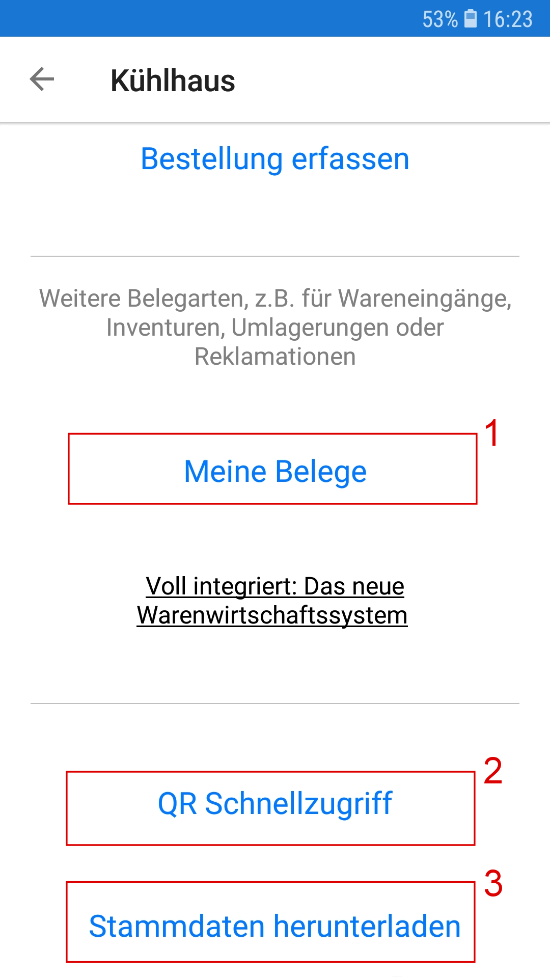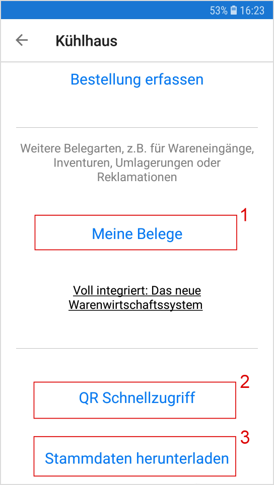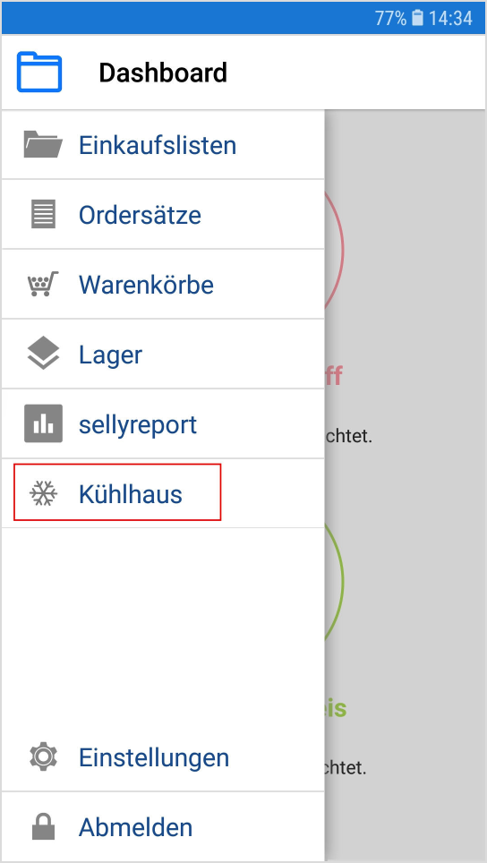 Sie starten, wie gewohnt, die Bestell-App sellyping und wechseln in den Bereich Kühlhaus (s. Bild links).