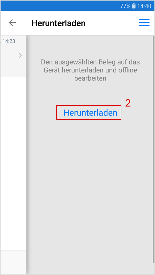 Mit Antippen dieses Beleges erhalten Sie nebenstehenden Hinweis und nutzen 2x den Link Herunterladen (s. Markierungen 1 + 2). Sie laden zuerst die Belegliste und nachfolgend den zutreffenden Beleg.