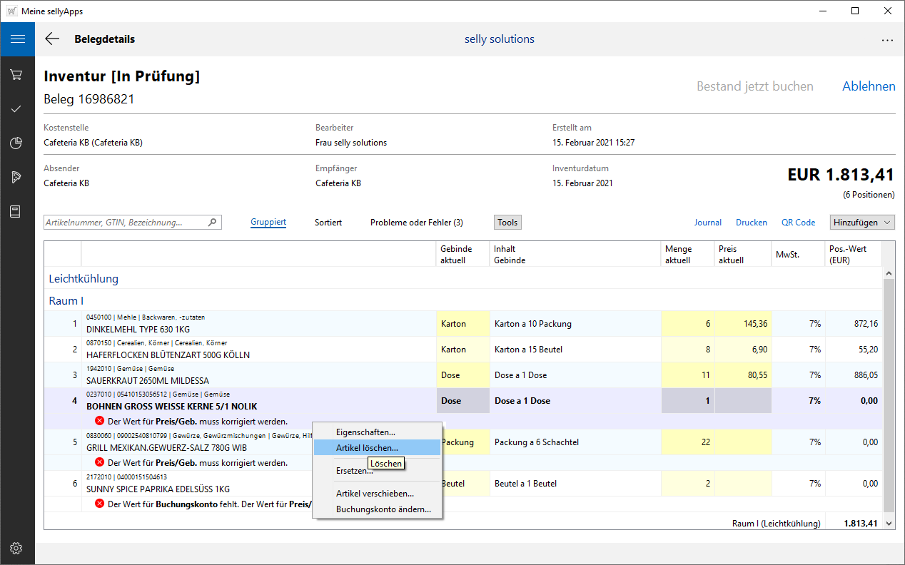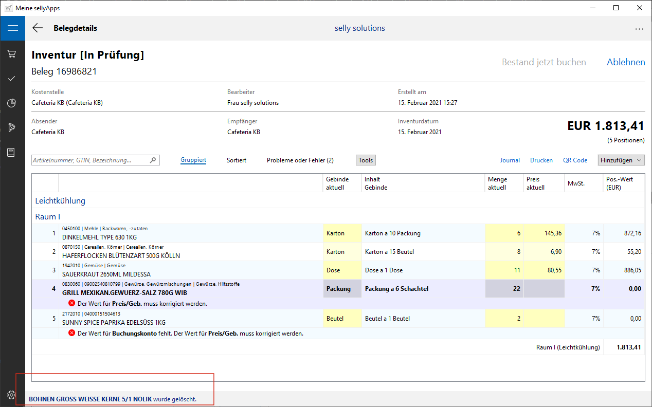sellyApps, im Belegcenter können Sie Positionen aus Ihrem Beleg entfernen.