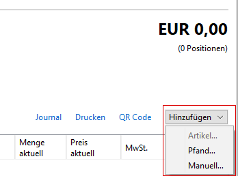 Bei dieser Belegart steht Ihnen, nach Klick auf die Schaltfläche [Hinzufügen], die Artikelübernahme nicht zur Verfügung, somit ist der Menüeintrag