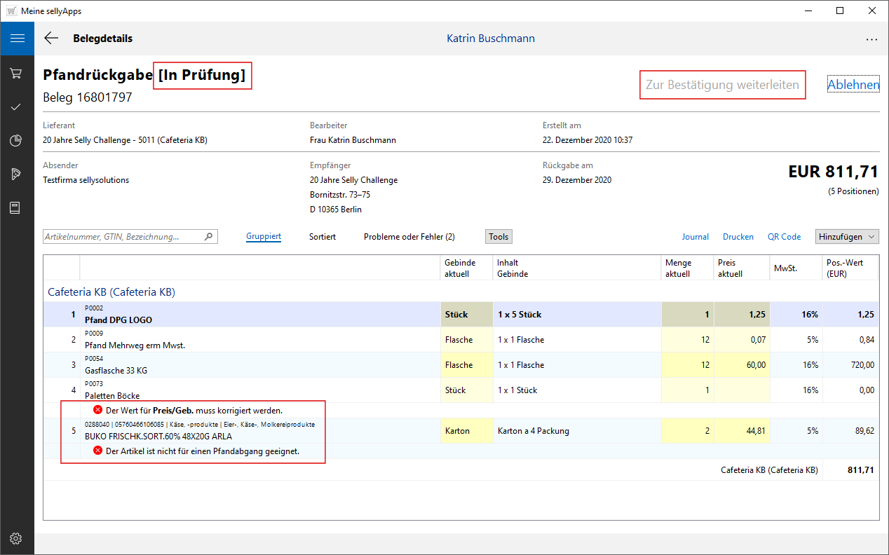 Ist bei einem Beleg mindestens eine Position mit dem Icon und einem Hinweis versehen, kann dieser Beleg in der Abfolge des Buchungsvorgangs trotzdem zur Prüfung weitergeleitet werden. Der Beleg hat nun den Status In Prüfung und muss jetzt spätestens korrigiert werden.