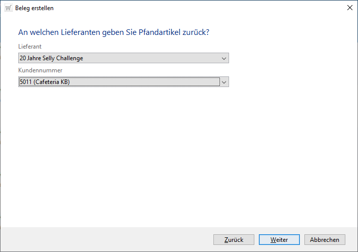 Nach dem ersten Schritt, dem Klick auf [Neu] in der Belegübersicht, wählen Sie den Belegtyp Pfandrückgabe und wechseln zum nächsten Schritt mittels Schaltfläche [Weiter].