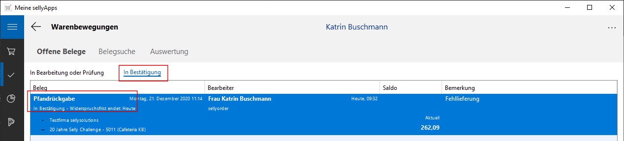 Der bestätigte Beleg ist nun in der Liste In Bestätigung und hat ebenfalls den Status In Bestätigung.