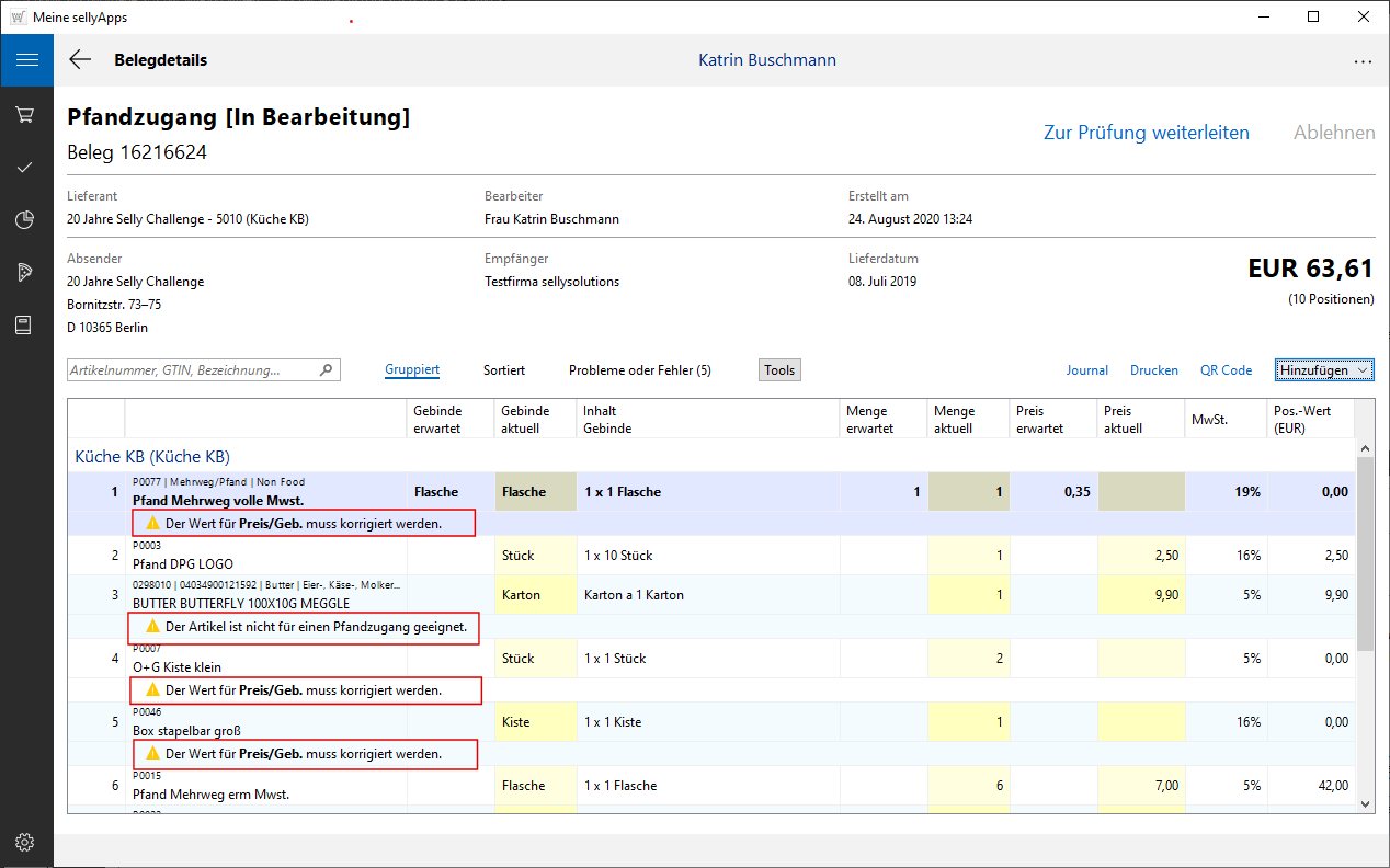 Belegübersicht - Pfandzugangsbeleg mit Fehlerhinweis