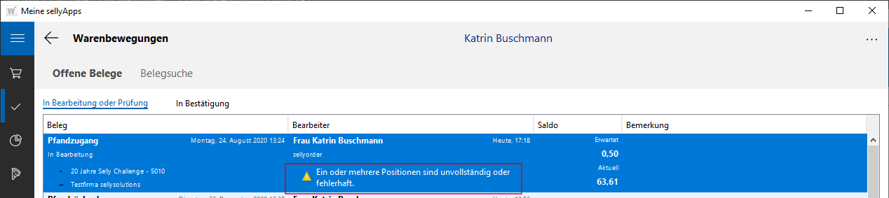 Der zuletzt erzeugte Pfandzugangsbeleg enthält bereits in der Belegübersicht einen Hinweis (s. Markierung), dass er mindestens eine Position enthält, die fehlerbehaftet ist.