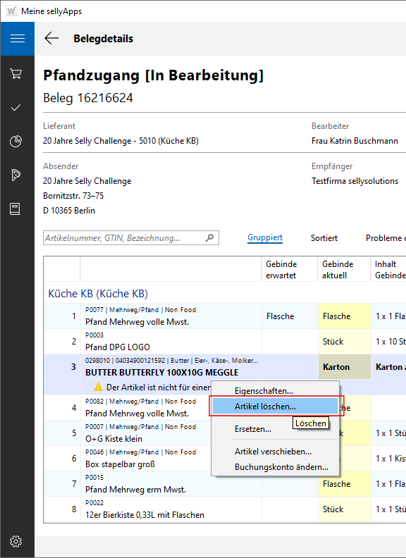 Haben Sie einen Artikel in Ihren Pfandzugangsbeleg übernommen, der nicht zu einem Pfandsortiment gehört und somit kein Pfandartikel ist, muss dieser aus dem Beleg entfernt werden.