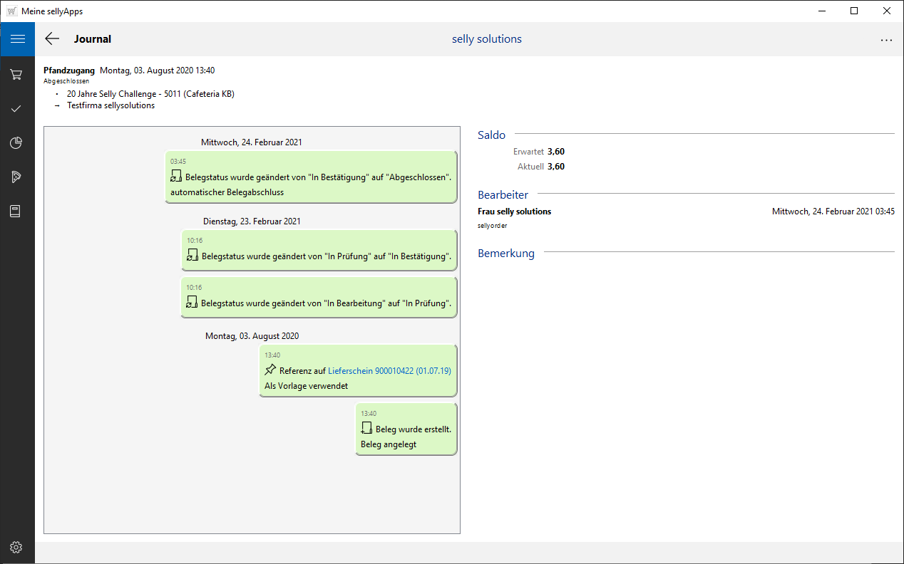 Es werden jeweils die Belegübergänge von Bearbeitung zur Prüfung, von Prüfung zur Bestätigung und letztendlich von der Bestätigung zum Abschluss dokumentiert.