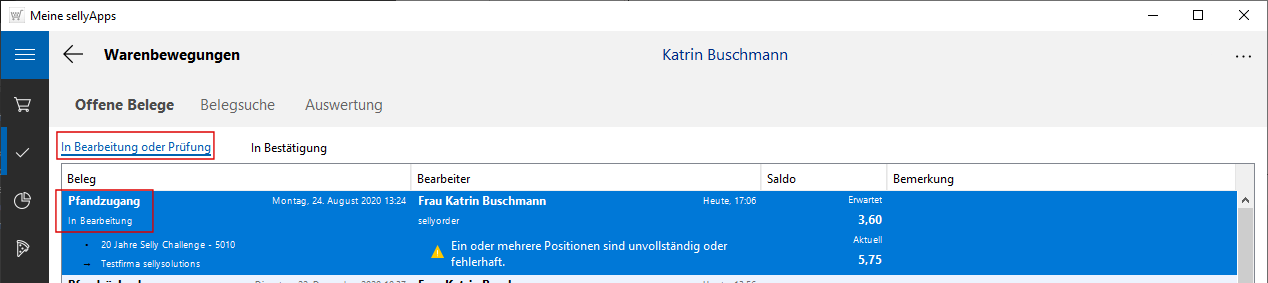 Der Beleg ist wieder mit dem Status In Bearbeitung gekennzeichnet.