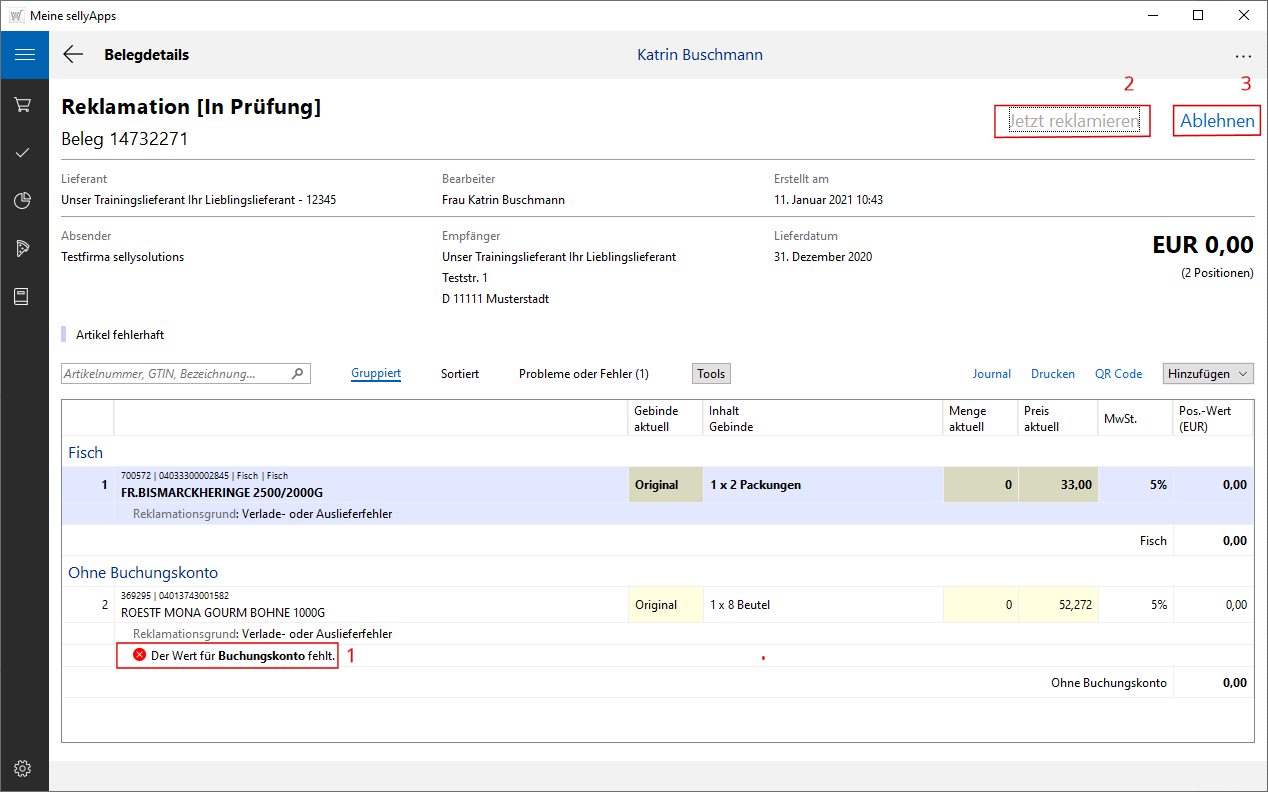 (s. Markierung 1), können Sie den Reklamationsvorgang nicht abschließen, somit ist der Funktionslink
