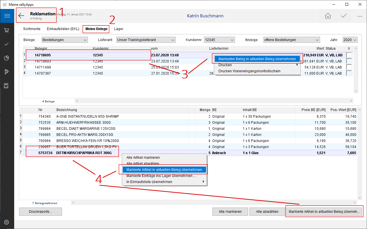 Zur Übernahme der Artikel in Ihren Beleg wählen Sie entweder die Bestellzeile in der oberen Tabelle (s. Markierung 3) und übernehmen alle unten aufgelisteten Artikel mittels rechter Maustaste oder Sie markieren einzelne Artikel in der unteren Tabelle (s. Markierung 4) und nutzen auch hier zur Übernahme das rechte Mausmenü.
