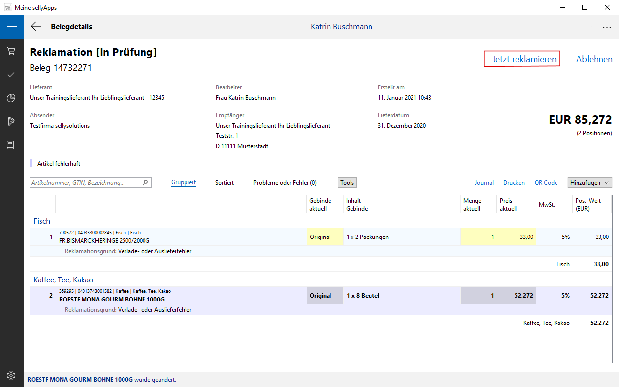 Ist der Beleg korrekt, können Sie die Reklamation durchführen. Sie nutzen dazu den Funktionslink Jetzt reklamieren (s. Markierung links).