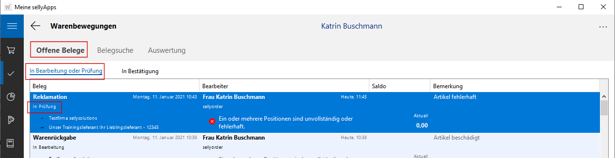 Der Beleg verbleibt auch nach Weiterleitung in der Liste In Bearbeitung und Prüfung, wird jetzt aber mit dem Status In Prüfung gekennzeichnet.