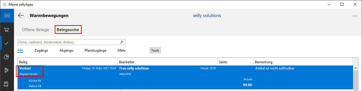 Jeder abgeschlossene Beleg ist im Belegarchiv zu finden, so auch Ihr Umlagerungsbeleg. Zum Aufruf bzw. Ansicht nutzen Sie den Funktionslink Belegsuche (s. Markierung). Der Beleg hat jetzt den Status Abgeschlossen (s. Markierung).