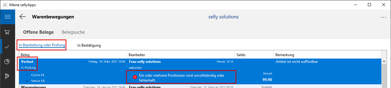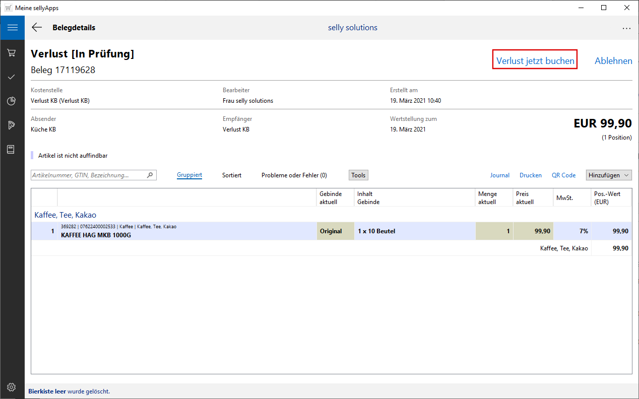 Wäre der Beleg in allen Positionen fehlerfrei, würde der Buchungsvorgang ohne Prüfung- bzw.- Bestätigungsschritt erfolgen (s. u. Verlust jetzt buchen). Es ist dafür ein entsprechendes Recht notwendig.
