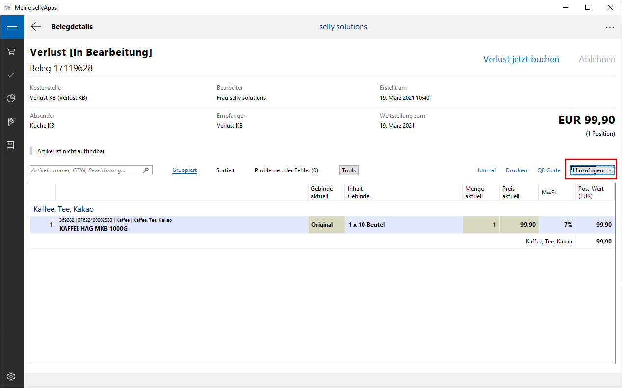 Im nächsten Schritt ergänzen Sie den oder die Artikel, die als Verlust gebucht werden sollen. Sie nutzen dazu das Menü Hinzufügen (s. Markierung).
