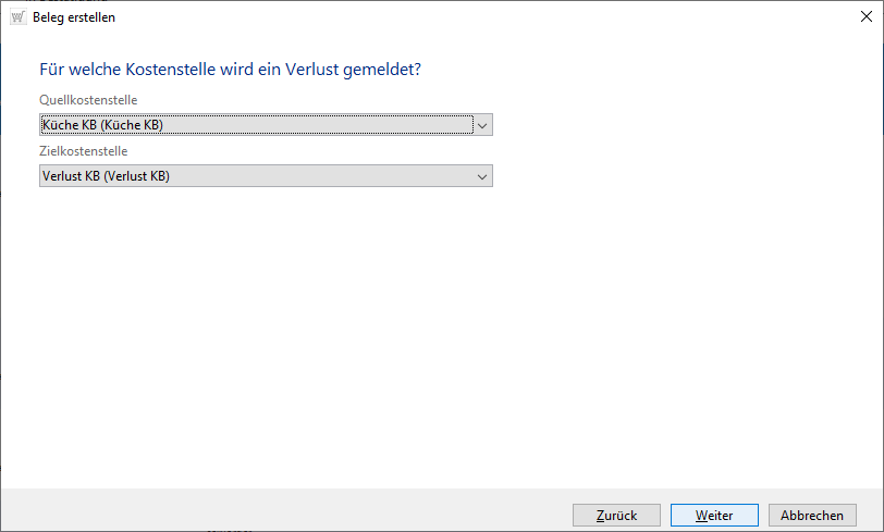 Den ersten Schritt erledigen Sie in der Belegübersicht, den Klick auf [Neu] und wählen anschließend den Belegtyp Verlust. Mittels Schaltfläche [Weiter] wechseln Sie zum nächsten Schritt.