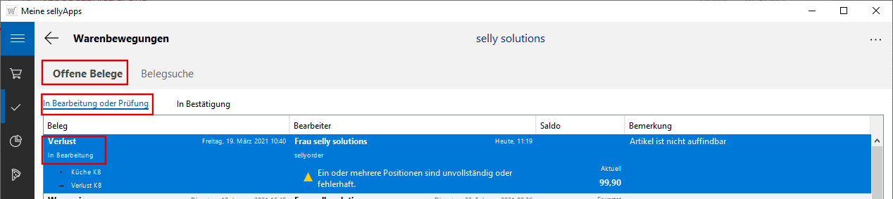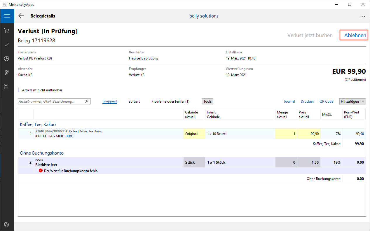 Das bedeutet, dass dieser Umlagerungsbeleg nicht gebucht werden kann und somit eine Ablehnung erfolgt, wonach der Beleg erneut im Status In Bearbeitung ist.