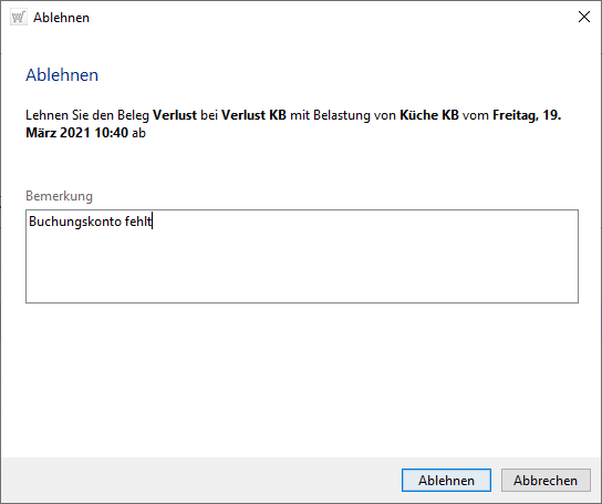 Erfolgt das Ablehnen muss im nachfolgenden Dialog eine Bemerkung angegeben werden.