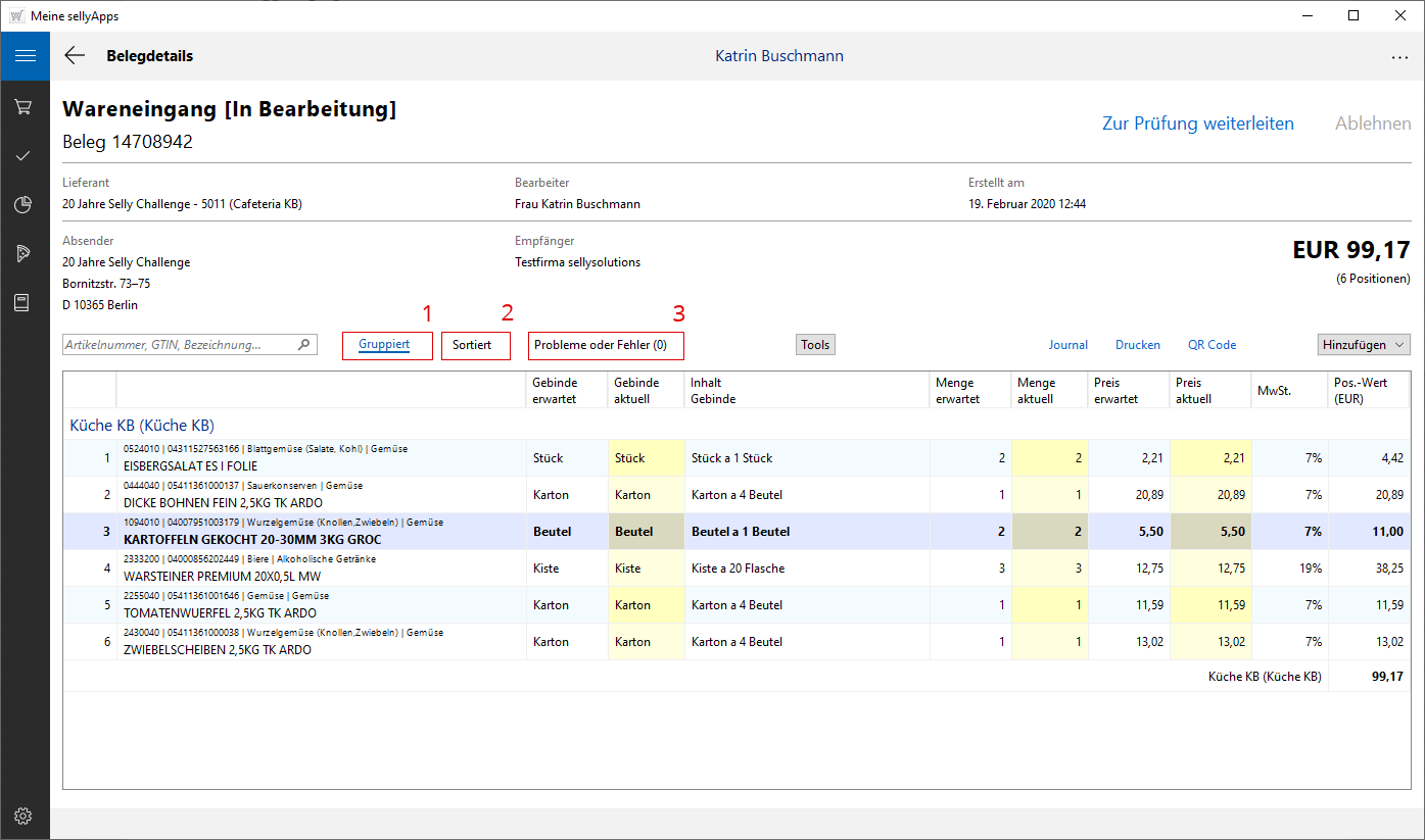 Sollten Fehlerhinweise an Positionen vorliegen, werden diese Artikelposition in einer separaten Liste (s. Markierung 3) zusammengefasst, die eine schnelle Sichtung ohne Suchen bzw. Scrollen zulässt.
