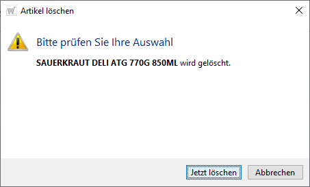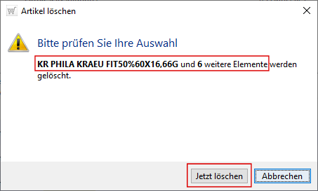 In der Systemnachfrage werden der erst markierte und anzahlmäßig alle weiteren zu löschenden Artikel benannt.