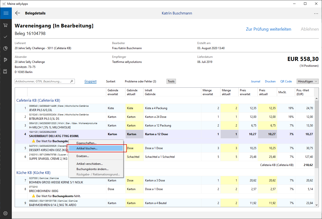 Beantworten Sie die Systemnachfrage mit Klick auf die Schaltfläche [Jetzt löschen], wird die Position aus dem Beleg gelöscht.