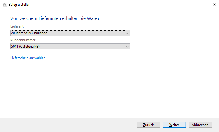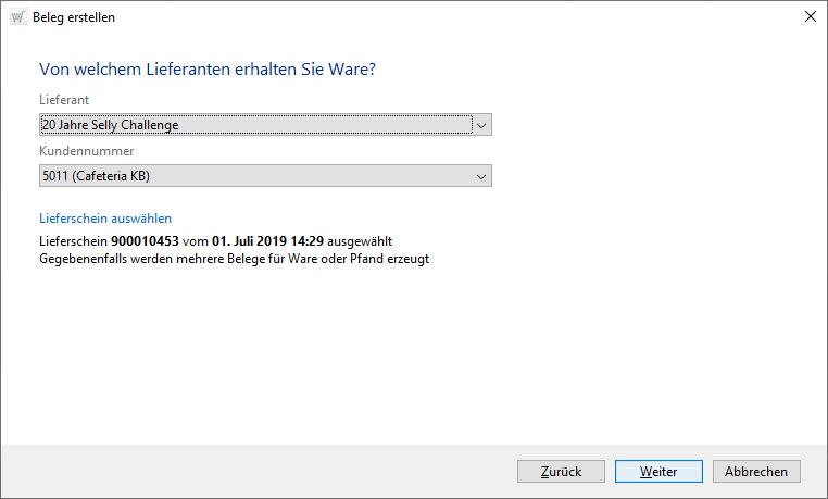 Sie sehen den bzw. die Lieferscheine aufgelistet, markieren den entsprechenden Beleg und wechseln mittels Schaltfläche [Weiter] zum nächsten Schritt.