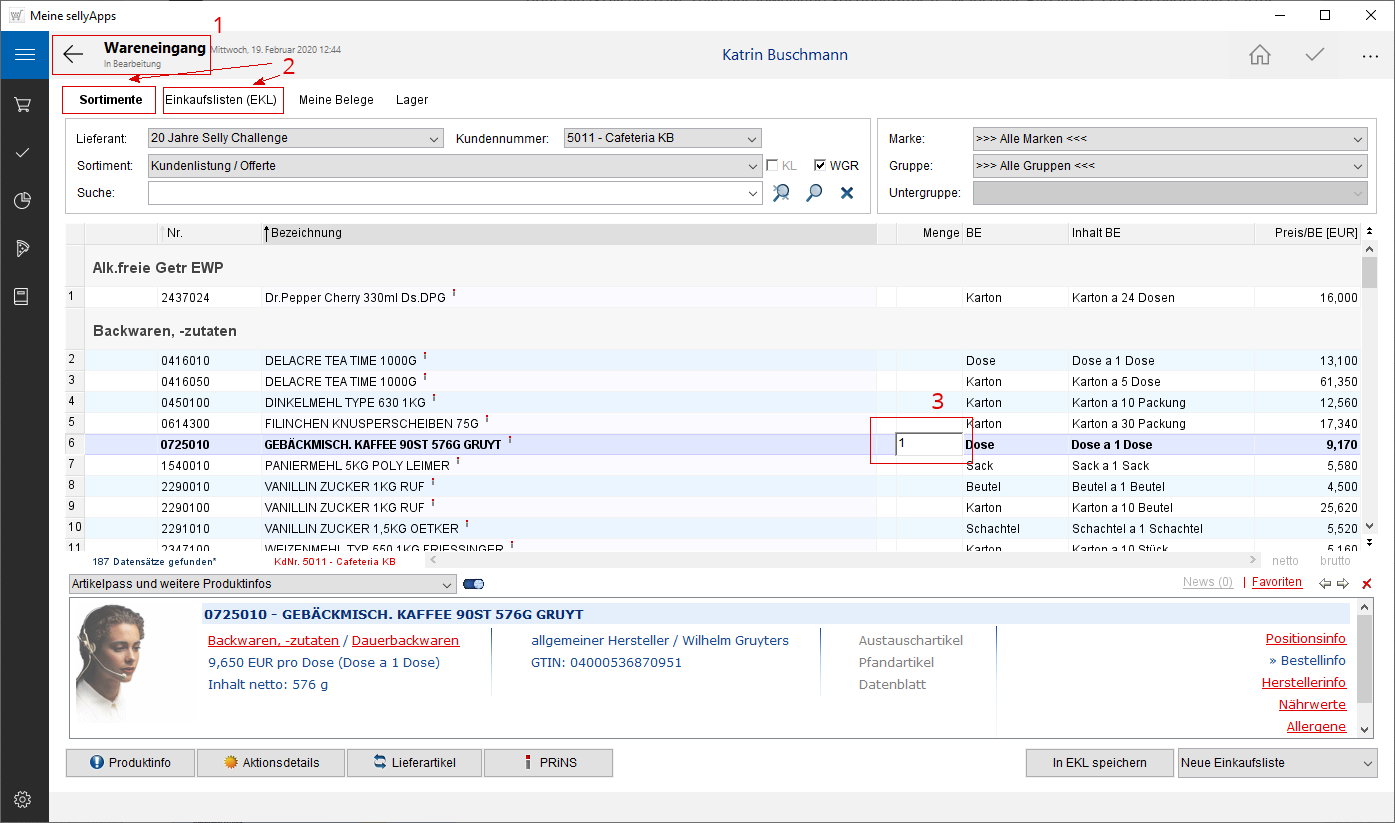 wechseln Sie in den Bereich Einkaufslisten (EKL) (s. Markierung 2) und wählen hier den entsprechenden Artikel durch Eintragen einer Bestellmenge aus.