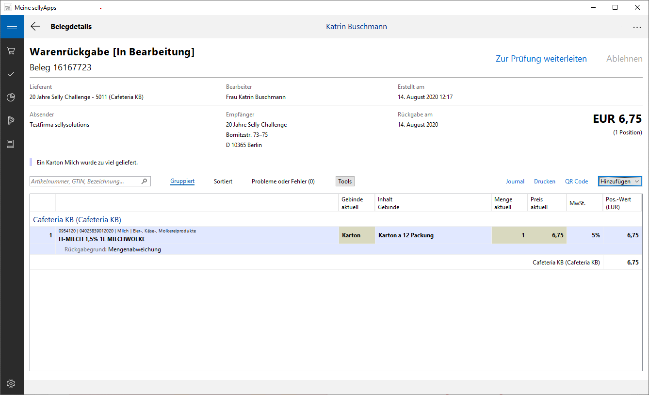 In den sellyApps, im Bereich Warenbewegungen, können Sie einen Beleg für eine Warenrückgabe erstellen und verbuchen.