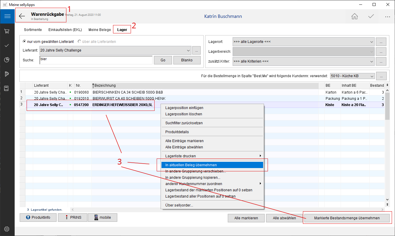 Zur Übernahme der Artikel in Ihren Beleg markieren Sie den oder die Artikel in der Tabelle (s. Markierung 3) und übernehmen den oder die Artikel analog mittels rechtes Mausmenü bzw. nutzen die die Schaltfläche [Markierte