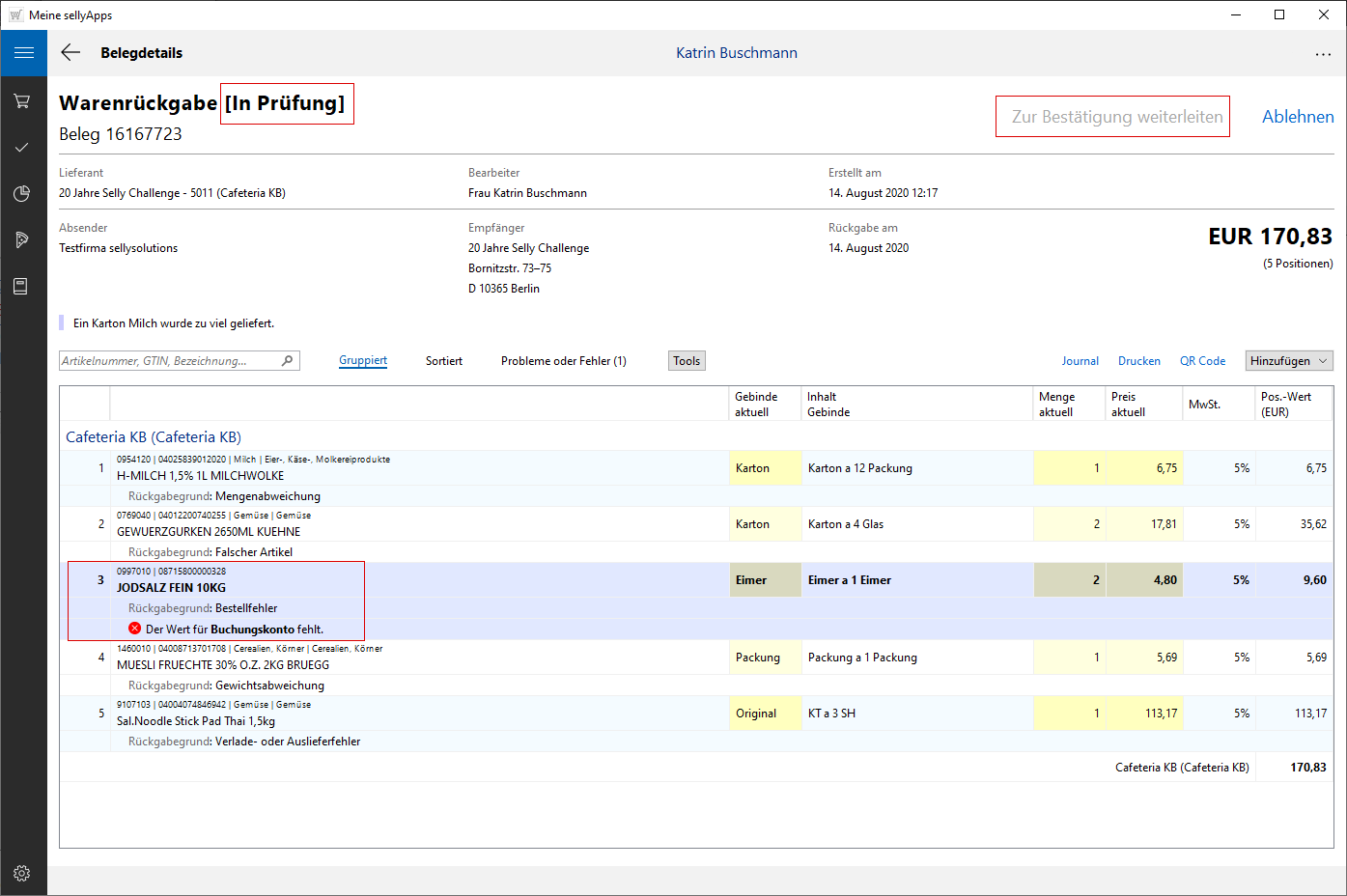 Ist der Beleg nicht in allen Positionen korrekt, können Sie diesen nicht zur Bestätigung weiterleiten, somit ist der Funktionslink inaktiv.