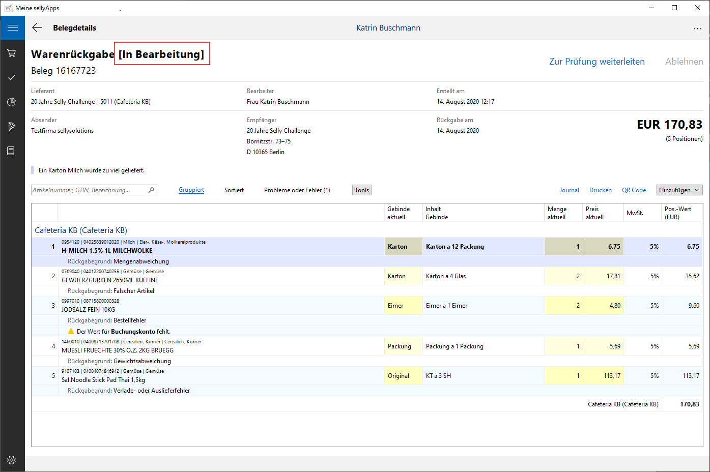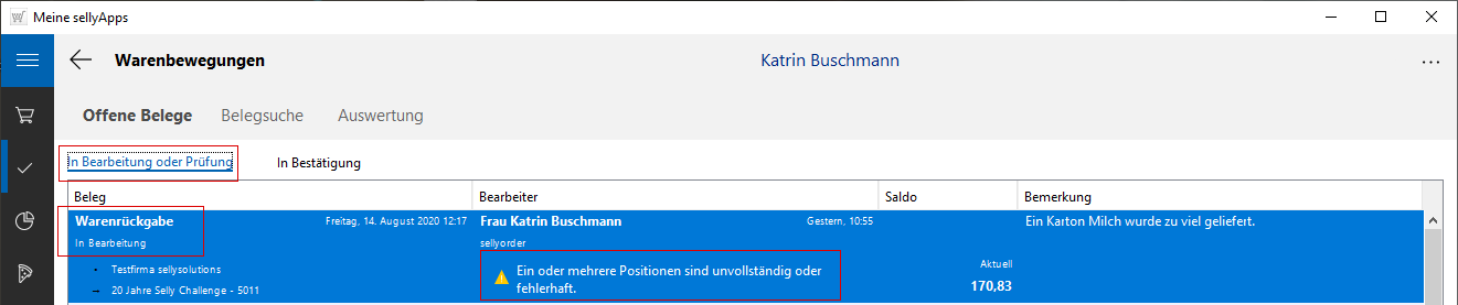 Ist bei einem Beleg mindestens eine Position mit dem Icon und einem Hinweis versehen, kann dieser Beleg in der Abfolge des Buchungsvorgangs trotzdem zur Prüfung weitergeleitet werden. Der Beleg hat nun den Status In Prüfung und muss jetzt spätestens korrigiert werden.