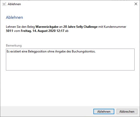 Erfolgt das Ablehnen muss im nachfolgenden Dialog eine Bemerkung angegeben werden.