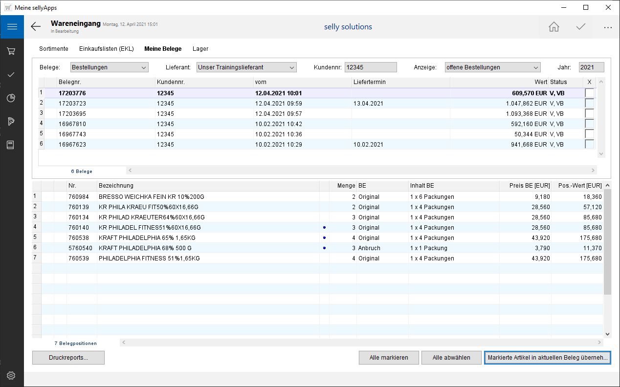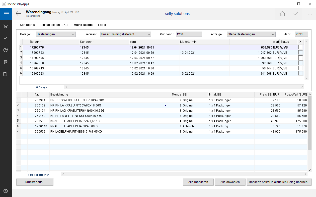 Bestellungen basiert, können Sie die Artikelübernahme in einen Wareneingangsbeleg schnell und unkompliziert aus den Bestelldaten in Meine Belege erledigen.