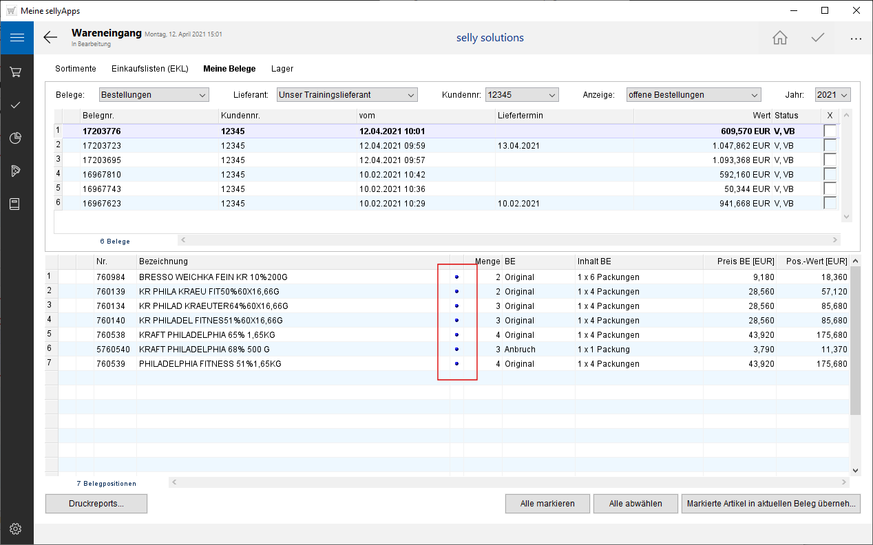 - Sie markieren einzelne Artikel in der unteren Tabelle (s. Markierung