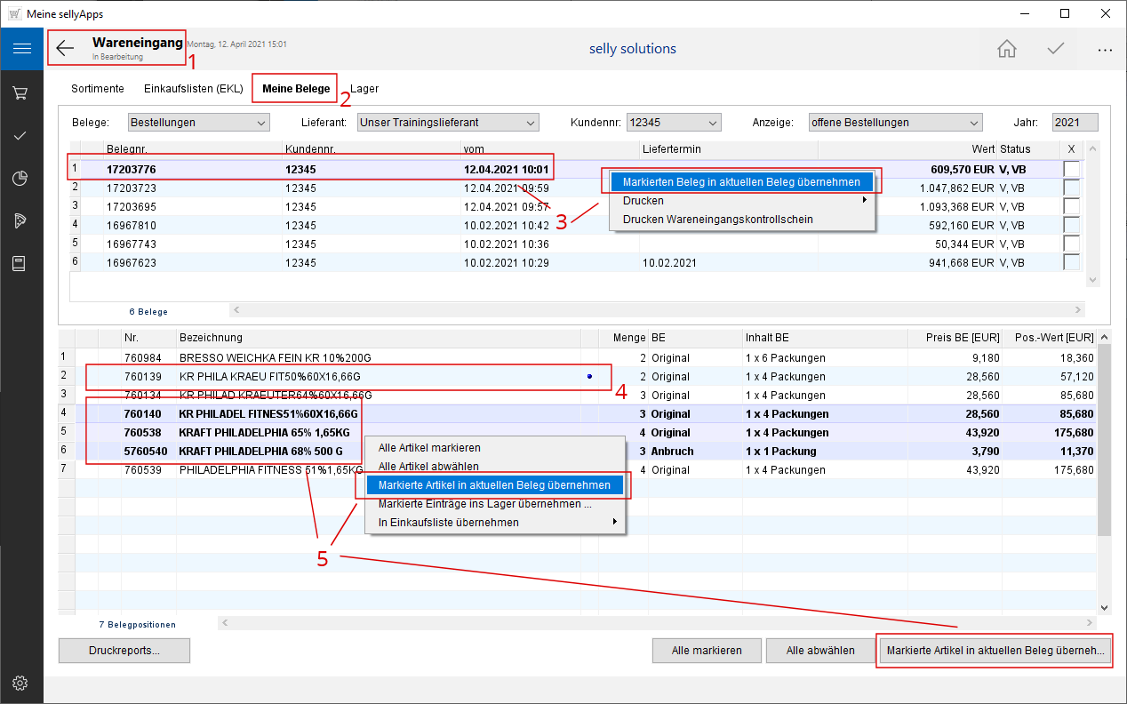 Übernahme das Kontextmenü (Eintrag Markierte Artikel in aktuellen Beleg übernehmen, s. Markierung 4) oder