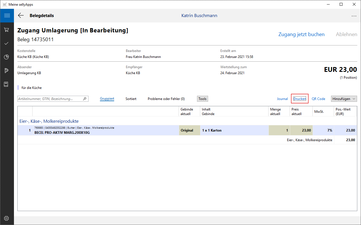 Alle Ihre erzeugten Belege über Warenbewegungen können Sie ausdrucken. Sie öffnen dazu Ihren Beleg in der Detailansicht und nutzen da die Druckfunktion.