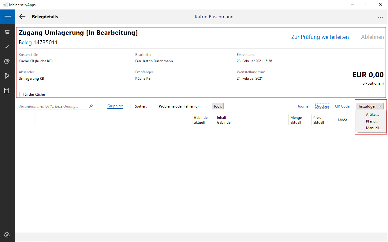 Im nächsten Schritt fügen Sie den oder die Artikel, den bzw. die Sie umlagern möchten, mittels Menü Hinzufügen (s. Markierung) zu Ihrem Beleg zu.