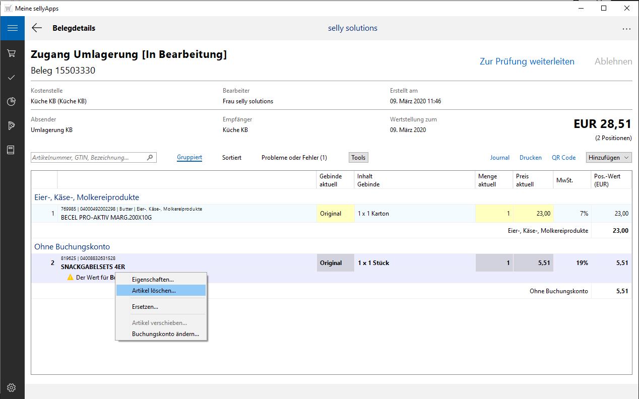 Umlagerungsbeleg, die Sie aus der Artikelliste entfernen