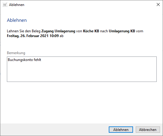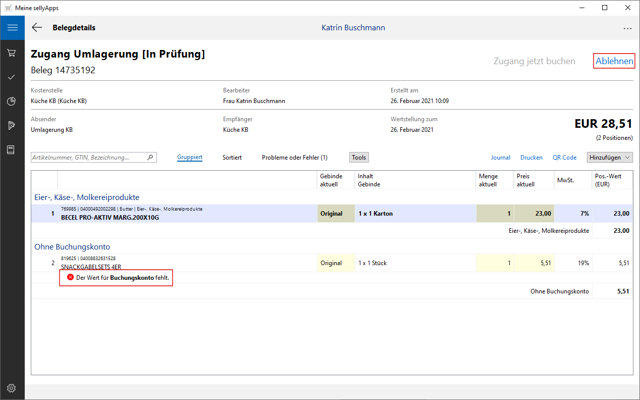 Im Bildbeispiel (links) fehlt bei einem Artikel die Angabe des Buchungskontos, somit ist der Beleg nicht korrekt und der Buchungsvorgang kann nicht abgeschlossen werden. Es erfolgt die Ablehnung.