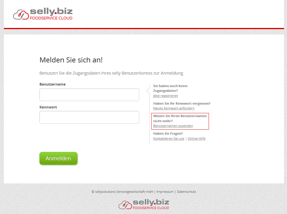 1. Klicken Sie im Anmeldedialog auf den Link Benutzernamen zusenden (s. Markierung) und geben in der neuen Maske Ihren Benutzernamen und die E-Mail-Adresse an, die Sie bei der Registrierung verwendet haben.